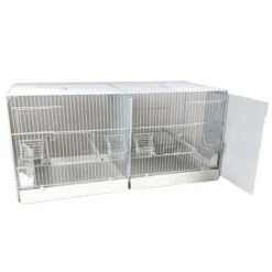 La face avant de la cage est composée de 2 portes ( 1 porte d’accès et 1 porte conçues pour mettre un nid) et de 2 mangeoires transparentes.